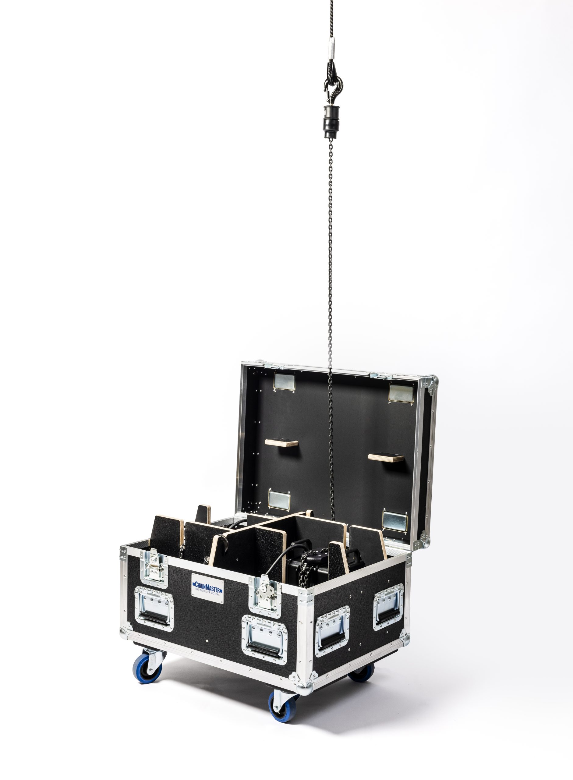 PSRIG:s “ready-to-use” package includes a pair of D8Plus Ultra 250 kg hoists housed in a robust double flight case. The package is customized with the customers preferred chain, FlipBag chain bag, chain hook, and suspension plate.